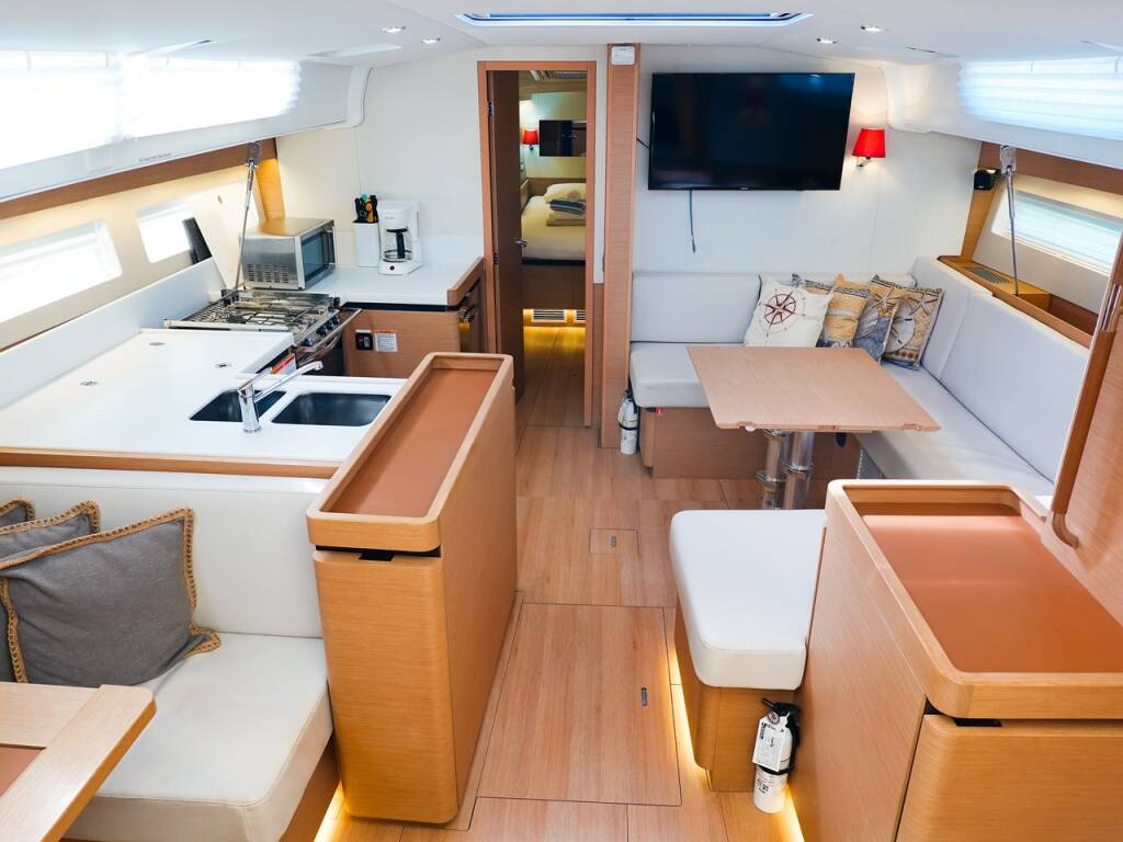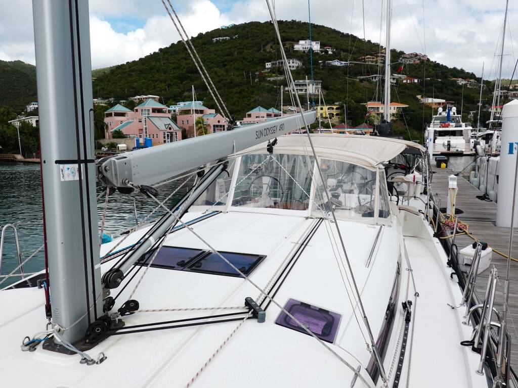 Sailing yacht Sun Odyssey 490 After Physics, built in 2020 is anchored in the BVI, Tortola, Nanny Cay Marina, British Virgin Islands, British Virgin Islands. It has 3 cabins, can accommodate 6 people and has 2 toilets. Bed linen and kitchen equipment are included in the price.