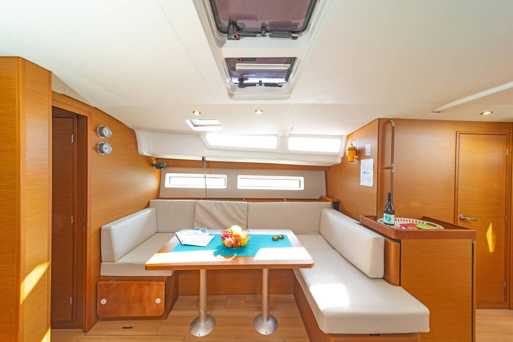 Sailing yacht Sun Odyssey 490 Funsea, built in 2022 is anchored in the Corfu, Gouvia Marina, Ionian Islands, Greece. It has 4 + 1 cabins, can accommodate 8 + 2 + 1 people and has 4 + 1 toilets. Bed linen and kitchen equipment are included in the price.