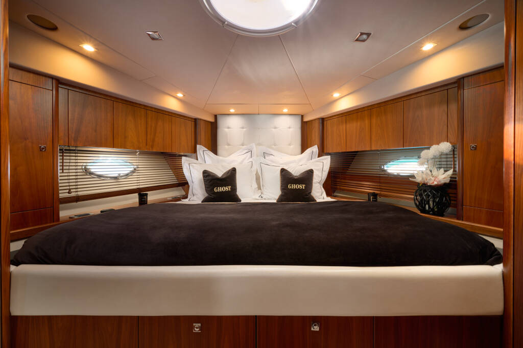 Motor yacht Sunseeker Predator 72 Ghost, built in 2008 is anchored in the Marina Kastela, Split region, Croatia. It has 3 + 1 cabins, can accommodate 6 + 2 people and has 3 + 1 toilets. Bed linen and kitchen equipment are included in the price.