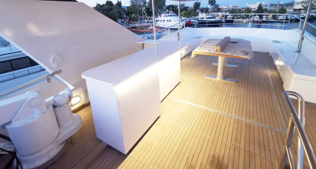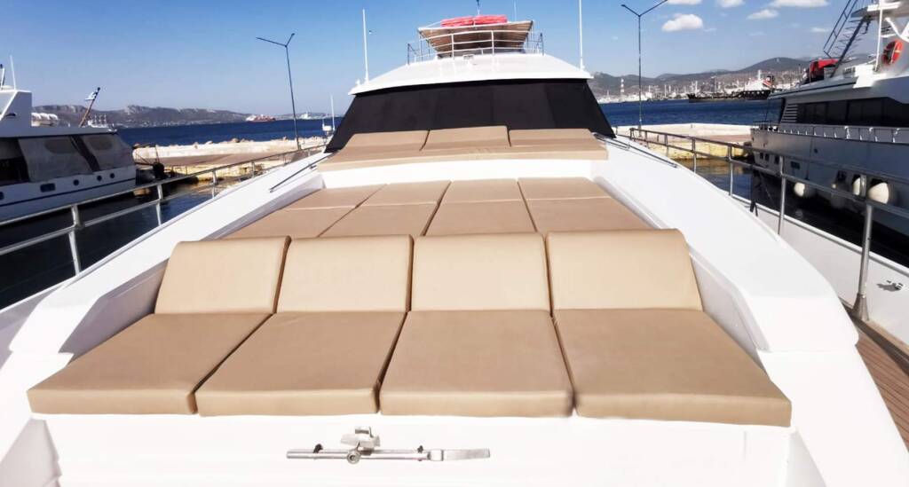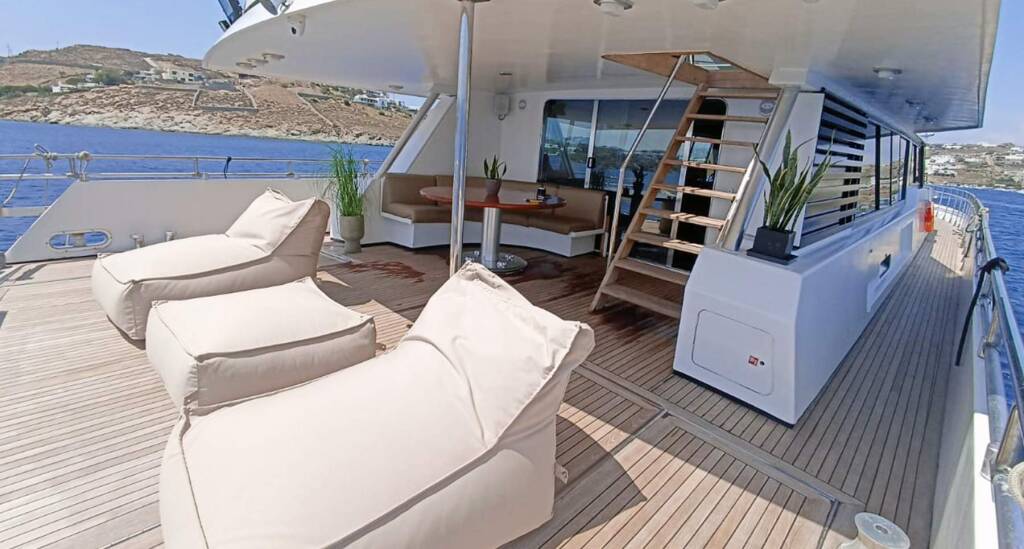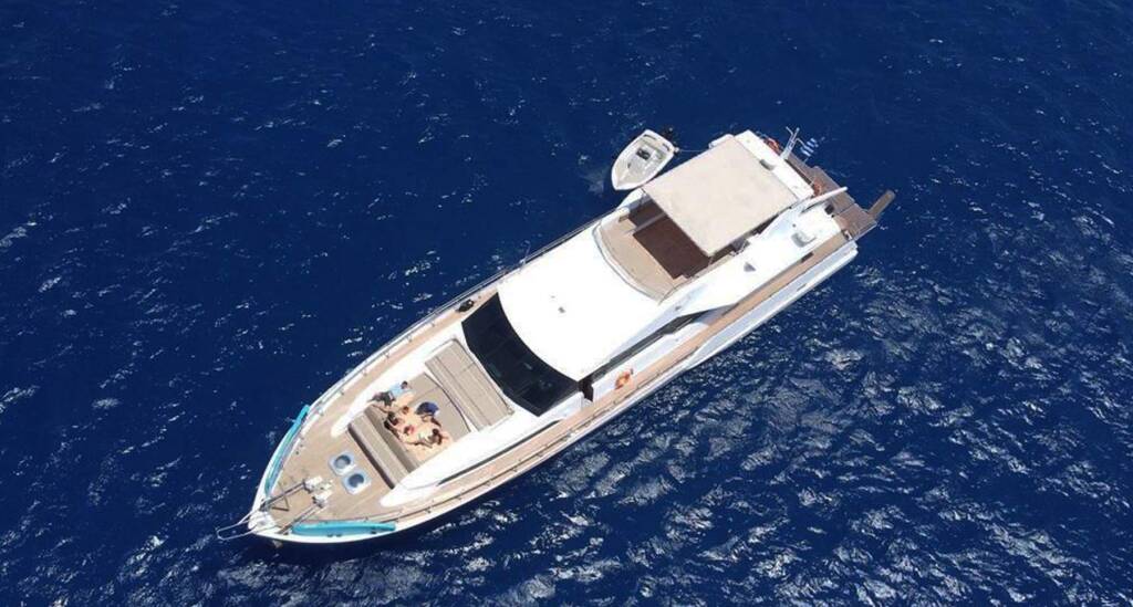 Motor yacht Tecnomarine 95 Lady Mytro, built in 1990 is anchored in the Mykonos, Cyclades, Greece. It has 2 + 2 cabins, can accommodate 4 + 3 people and has 2 + 1 toilets. Bed linen and kitchen equipment are included in the price.