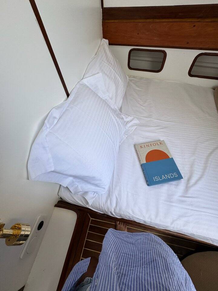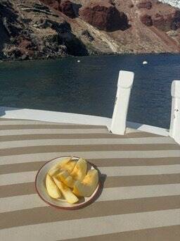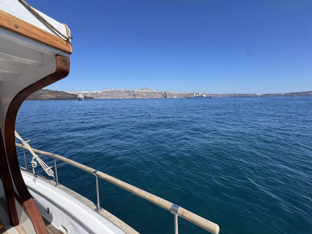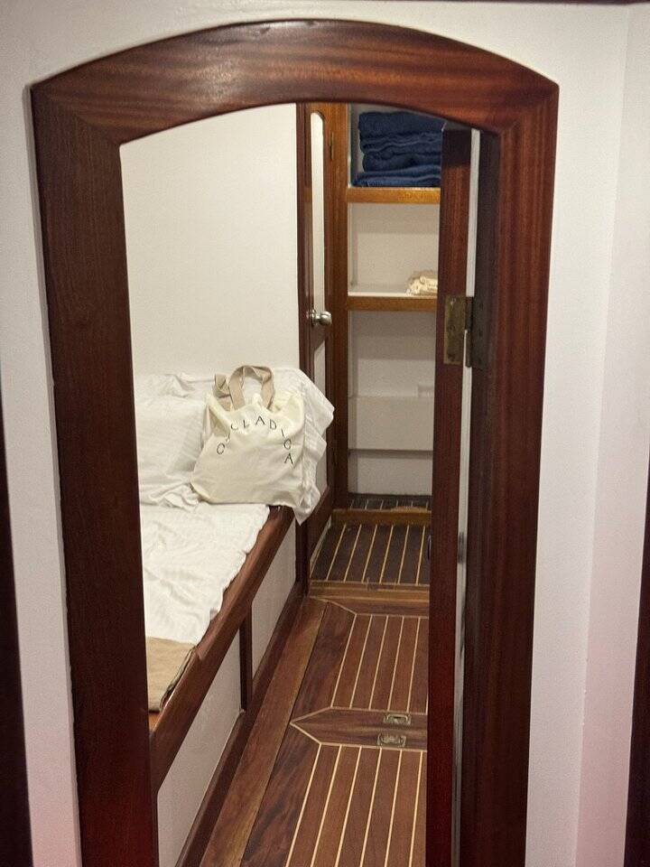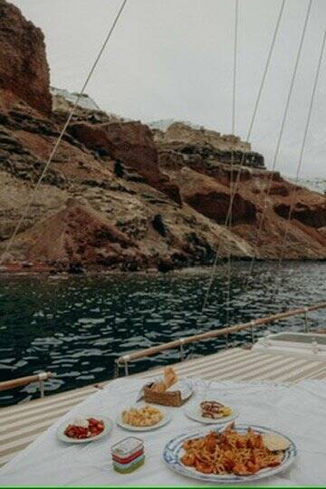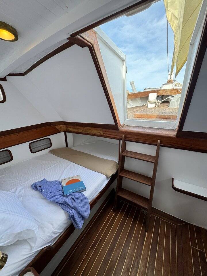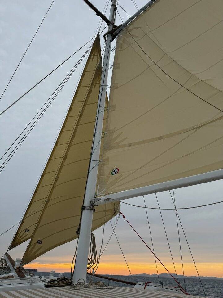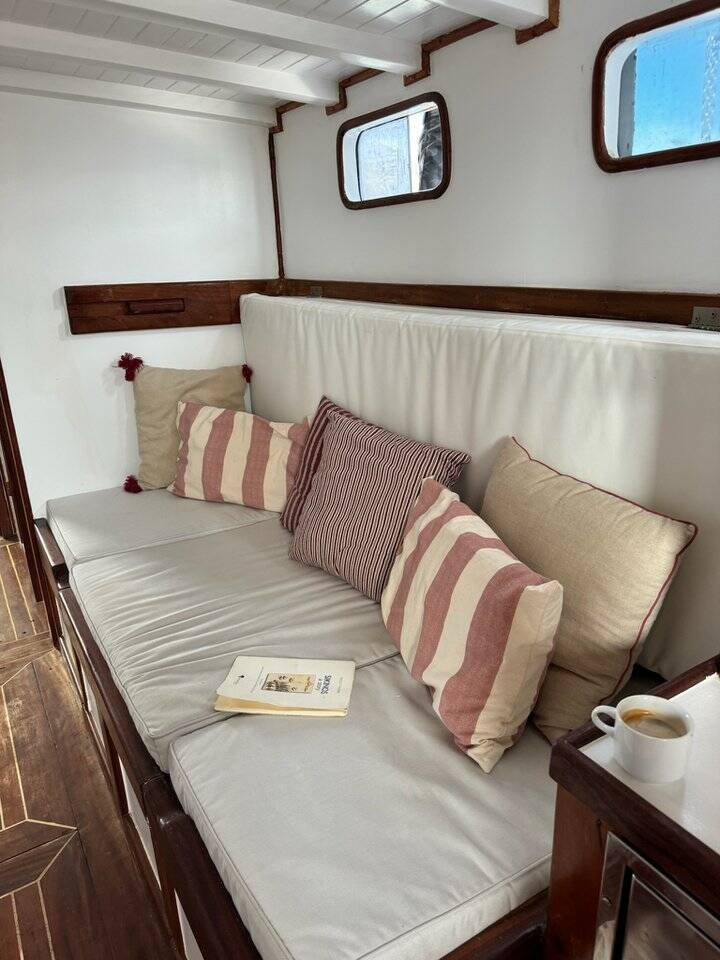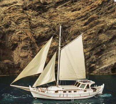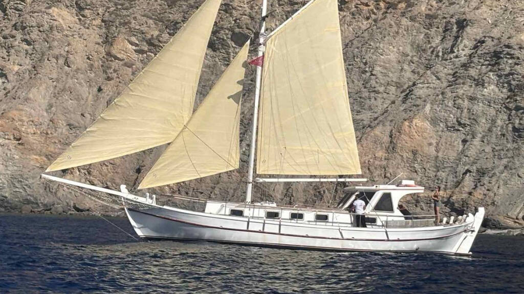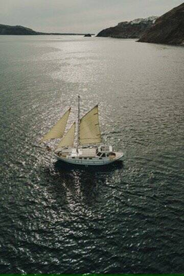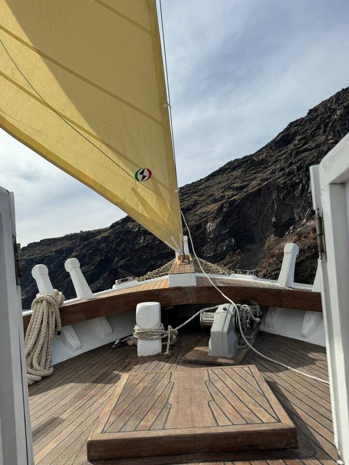 Wooden yacht Trehandiri Kymatia, built in 1999 is anchored in the Santorini, Vlyhada Μarina, Cyclades, Greece. It has 3 cabins, can accommodate 7 + 2 people and has 2 toilets. Bed linen and kitchen equipment are included in the price.