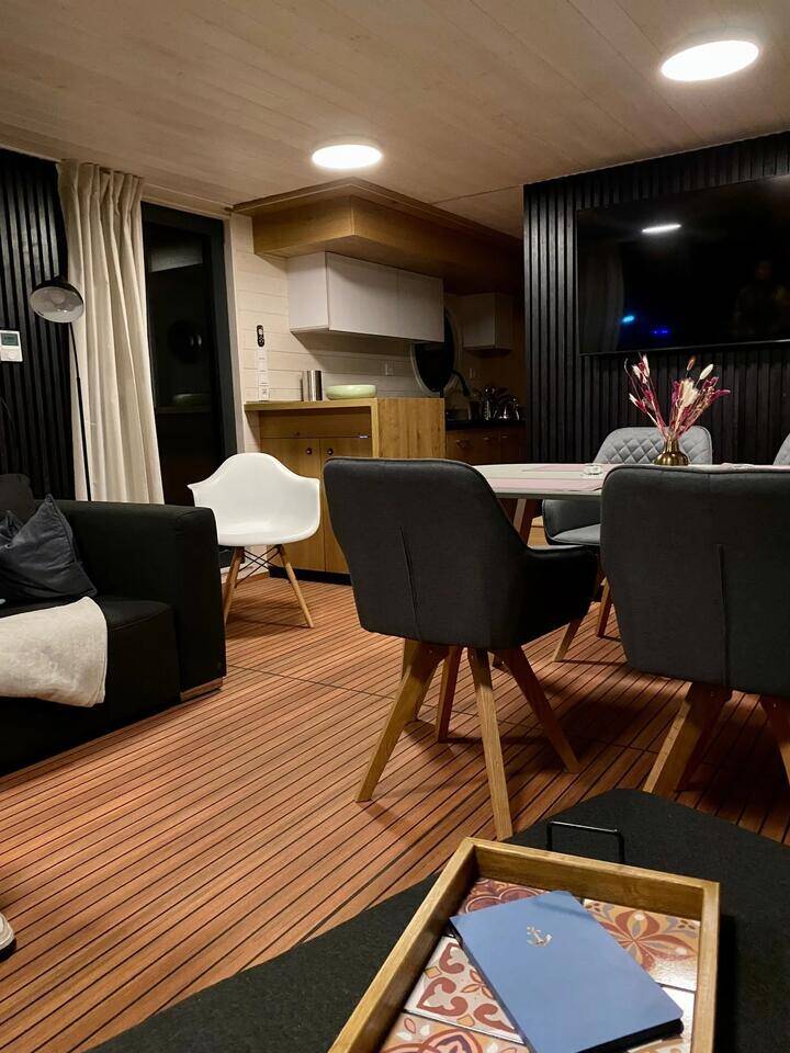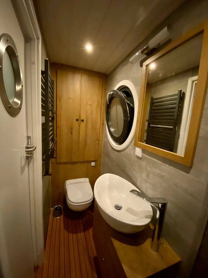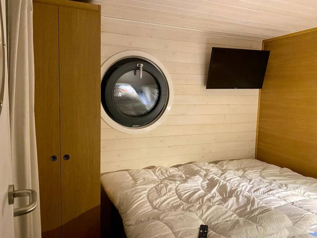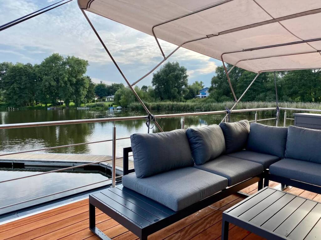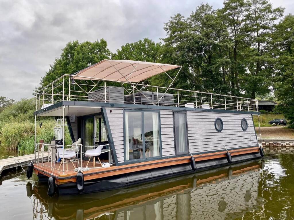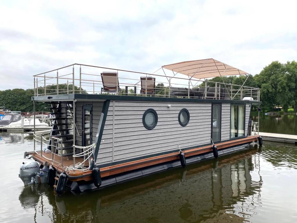 House boat Woma D13 RedWine, built in 2022 is anchored in the Röblinsee Marina, Brandenburg, Germany. It has 2 cabins, can accommodate 7 people and has 1 toilets. Bed linen and kitchen equipment are included in the price.